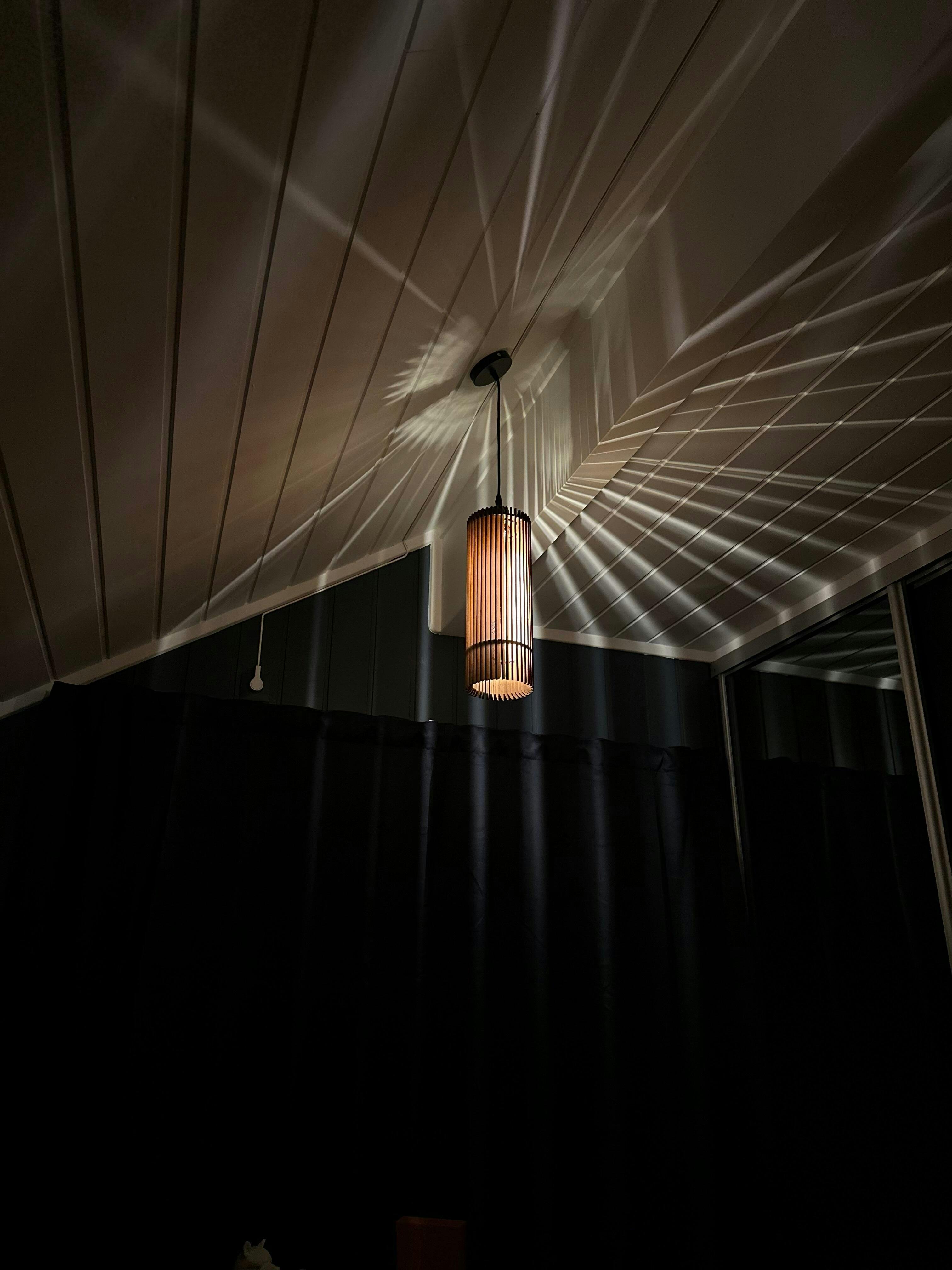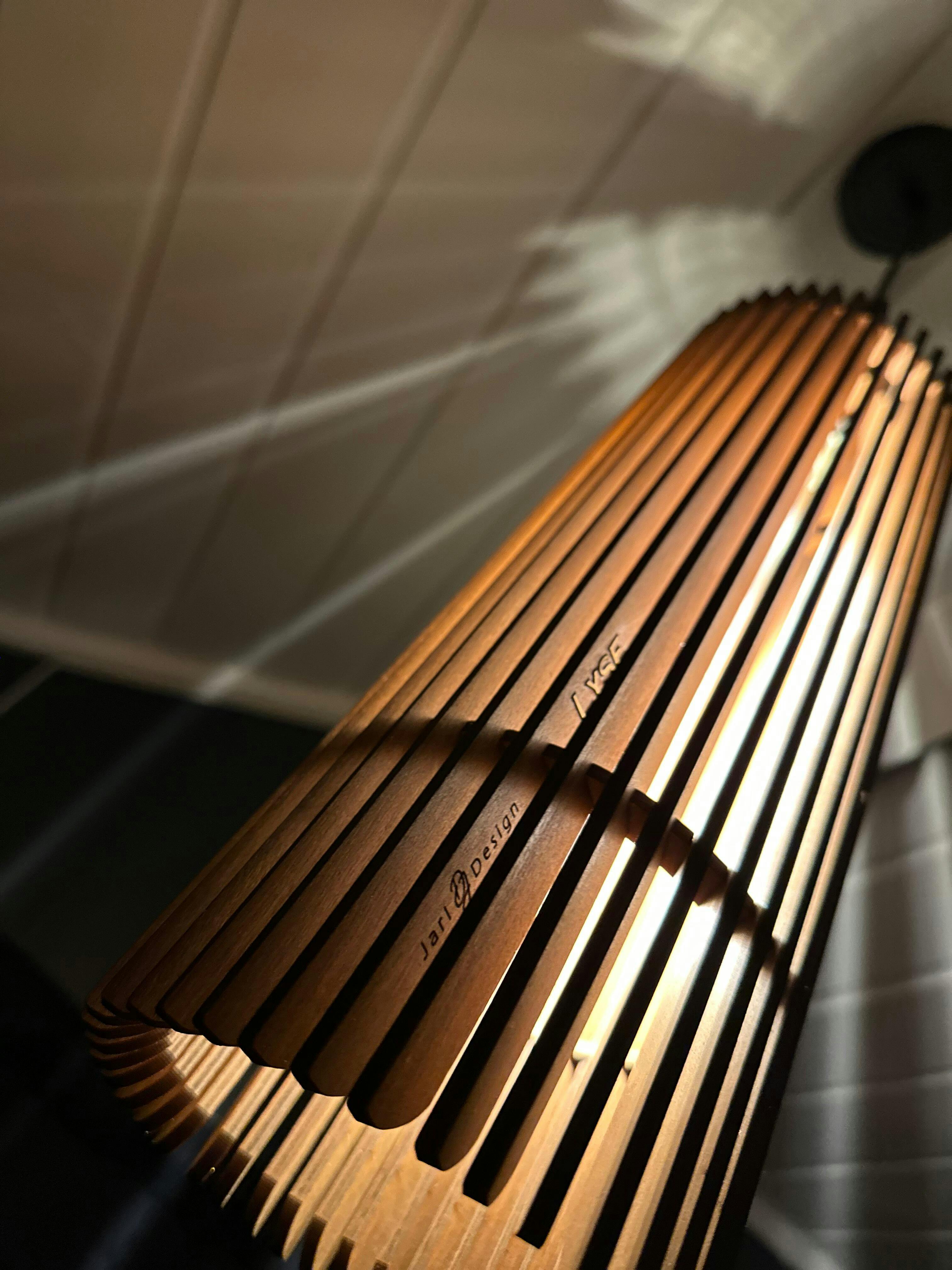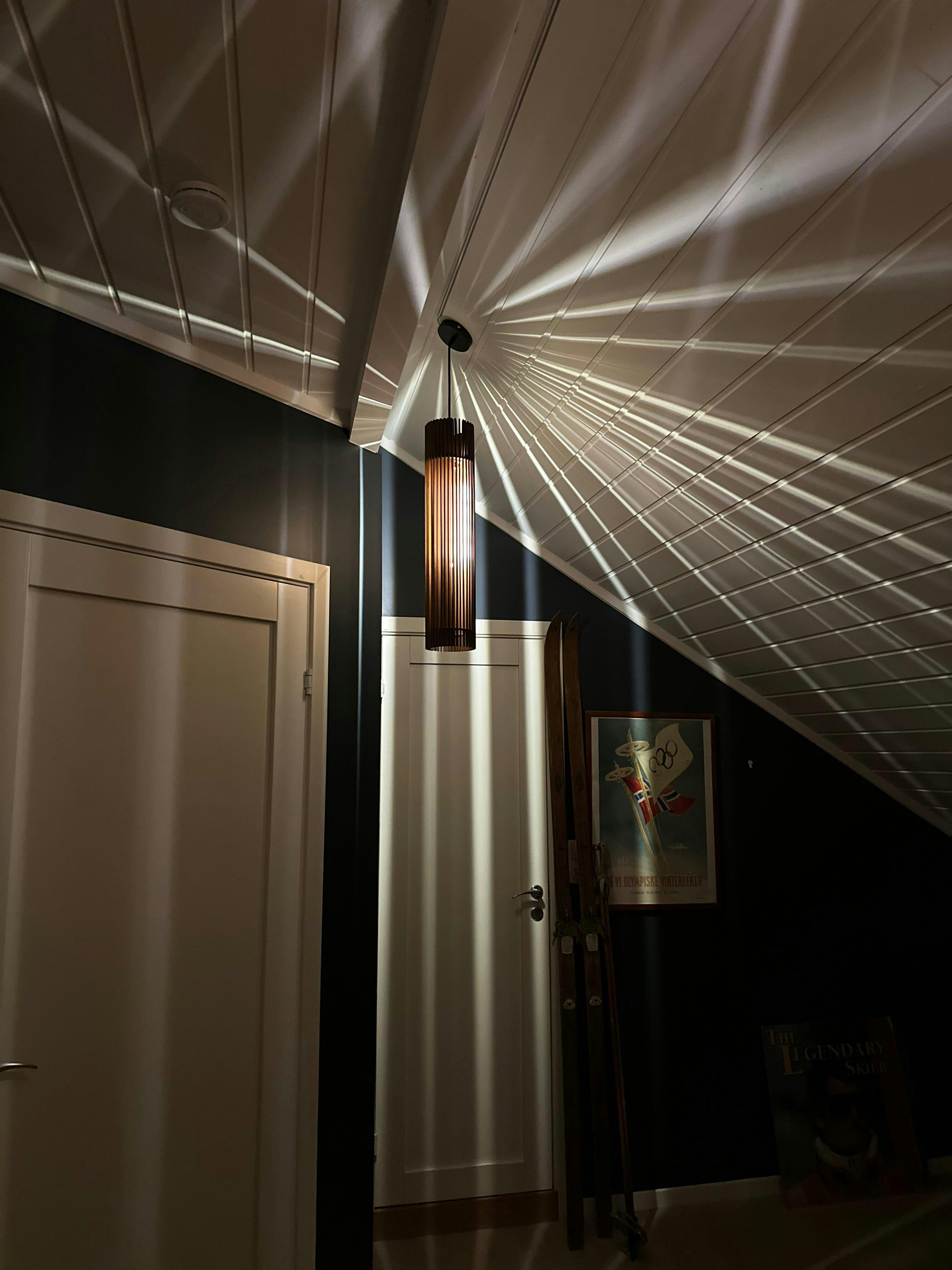 Jag är otroligt nöjd med lampan Lyse från Jarl Design. Den ger ett varmt och behagligt ljus, och mönstret som sprider sig i taket gör verkligen trappen till något speciellt.